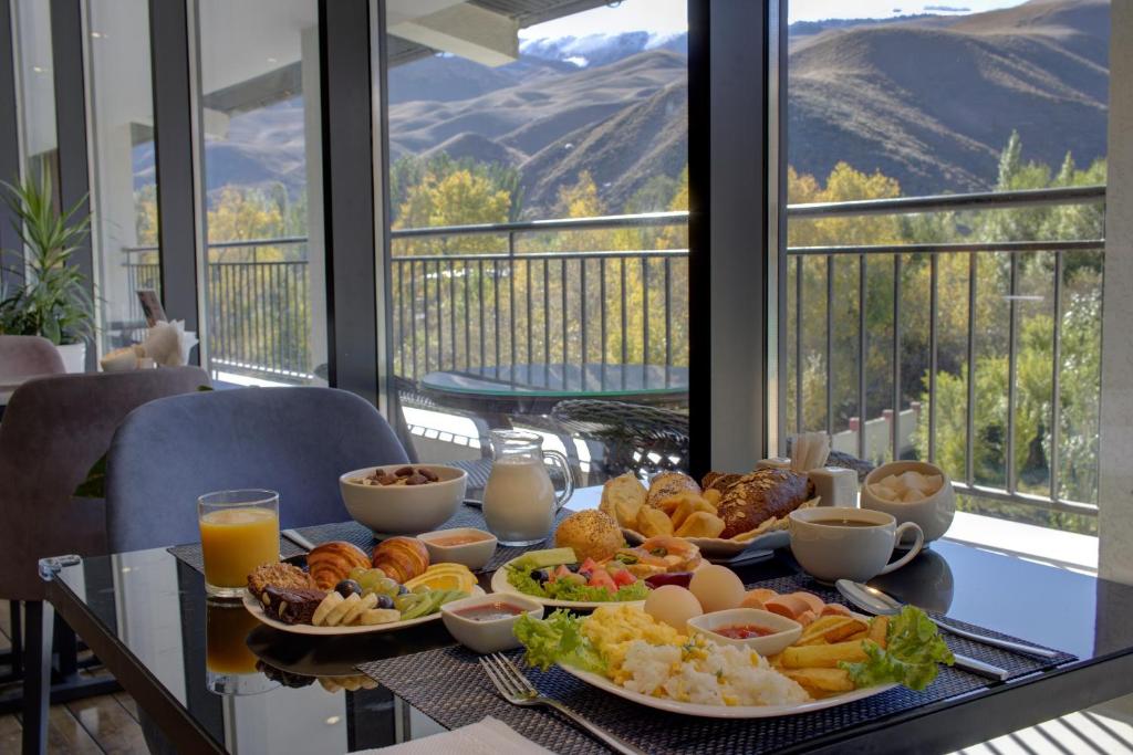 Dining is centred around the Epos Restaurant, which serves buffet breakfast, lunch, and dinner, with options spanning European, local Kyrgyz, and Eastern cuisines. The terrace provides sweeping views of the surrounding peaks, making meals a highlight of the stay.