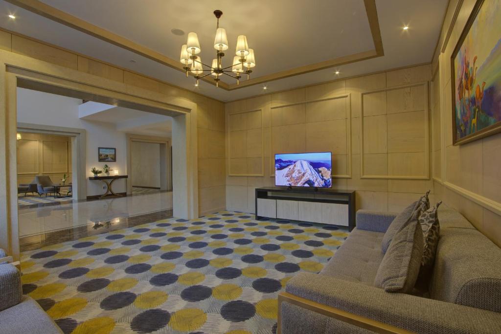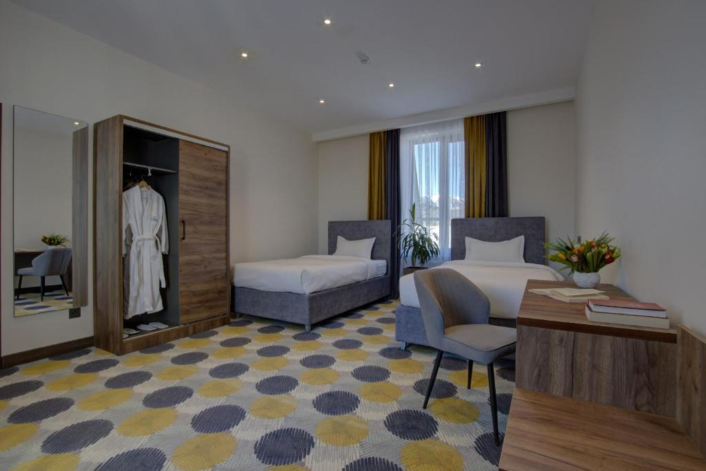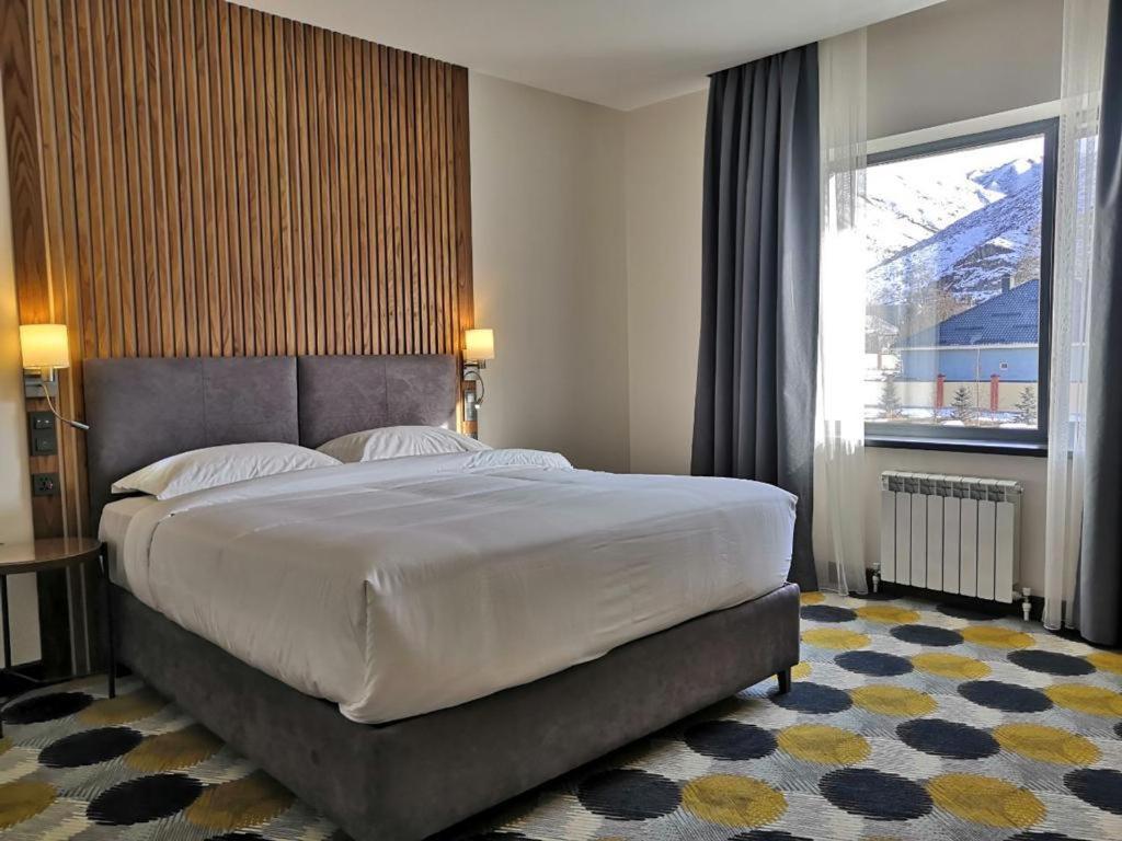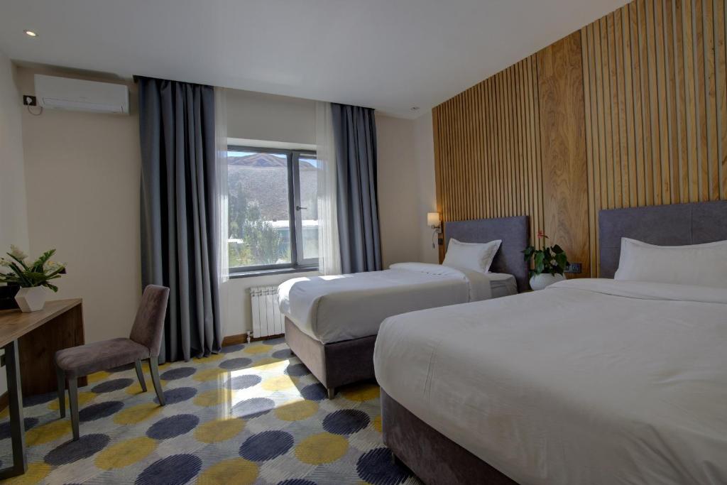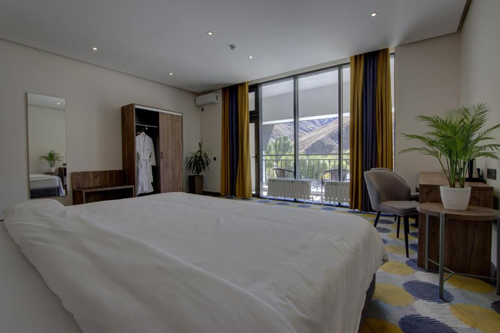 Perched in the alpine heart of Naryn, the Grand Khan Tengri Hotel offers a comfortable and modern base for exploring Kyrgyzstan’s high‑mountain landscapes. The hotel blends contemporary European design with practical facilities, making it ideal for this remote region. Guest rooms are large with king or twin beds and mountain views. All rooms are equipped with climate control, electronic locks, free Wi‑Fi, tea and coffee making facilities, TV, and well-appointed bathrooms with bathroom products.