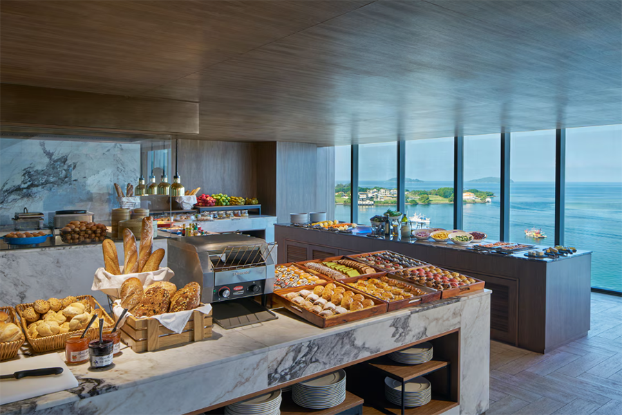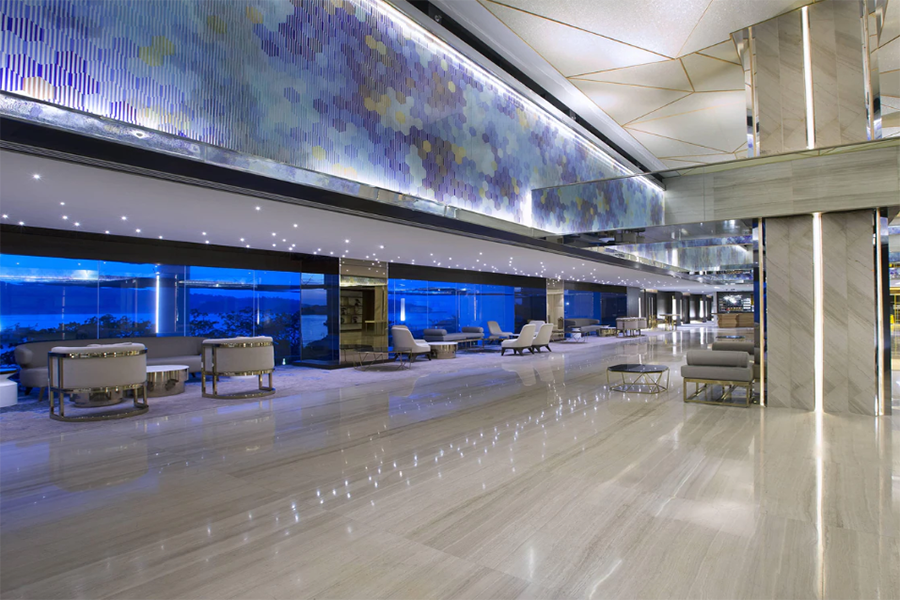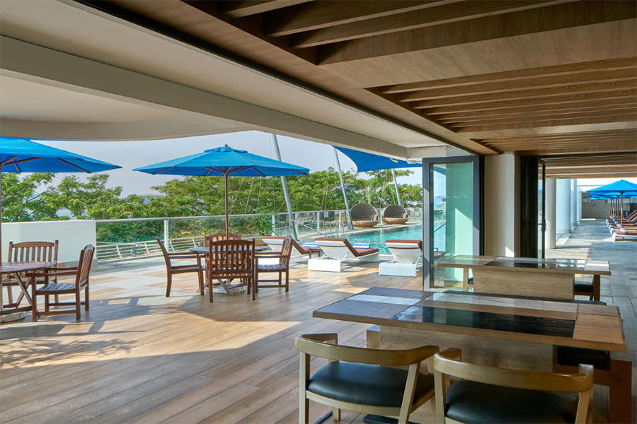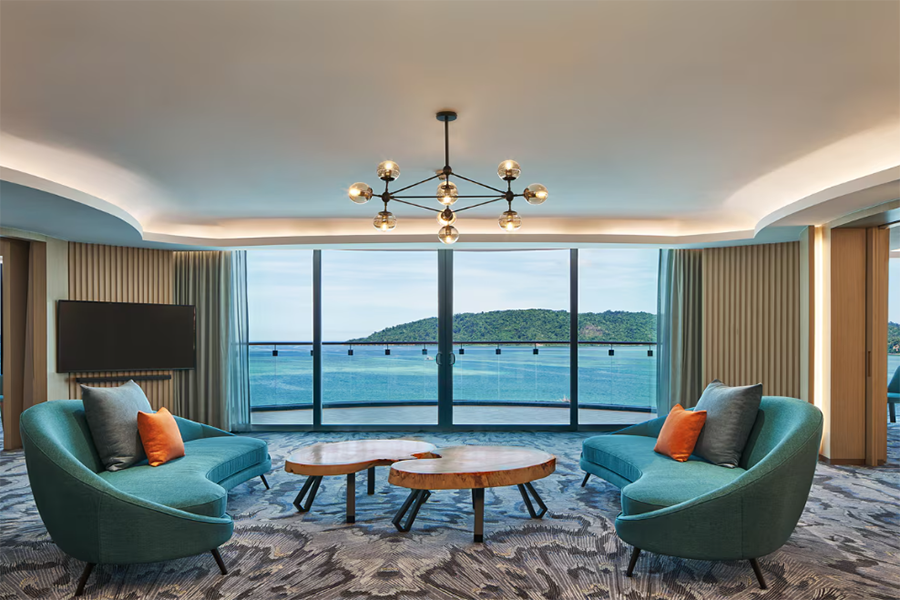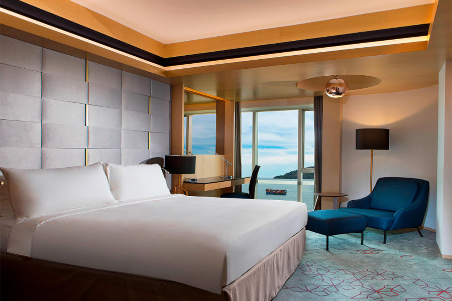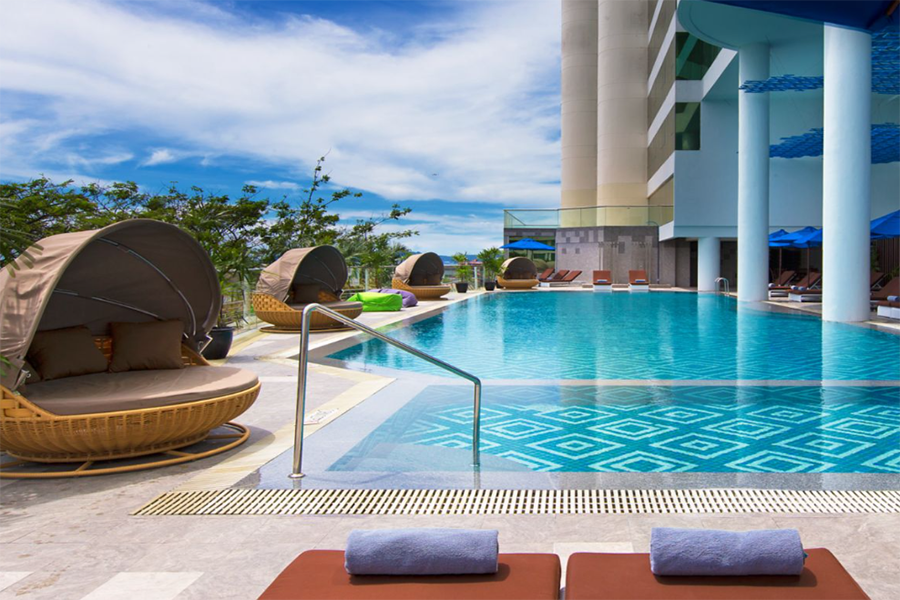 Guests have access to a wide range of facilities: spacious rooms and suites (many with sea views), an outdoor pool, a rooftop bar with panoramic sunset views over the South China Sea, and several dining venues including Italian and international cuisine.