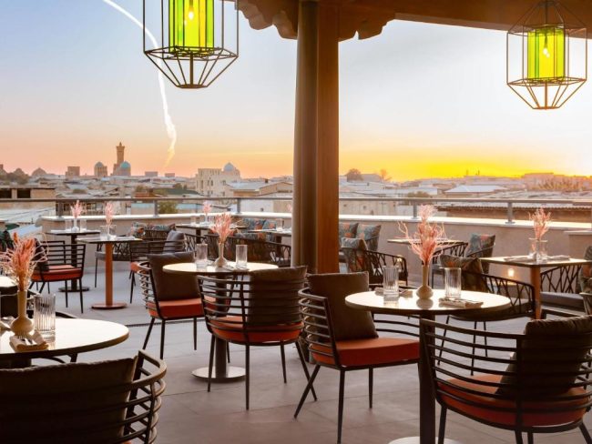 Facilities include a serene spa and wellness complex featuring a traditional hammam, sauna, indoor pool, and fitness centre, ideal for unwinding after a day of sightseeing. The rooftop restaurant serves both local and international cuisine with sweeping views of Bukhara’s skyline, complemented by a stylish lobby bar for afternoon tea or evening cocktails.