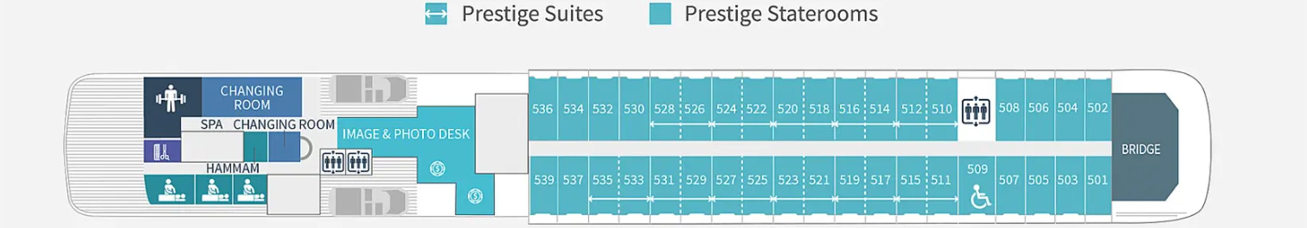 The Prestige Staterooms, located on Decks 4, 5, and 6, are similar in size and amenities to the Deluxe Staterooms but offer the advantage of being on higher decks and have floor-to-ceiling sliding door access to your private balcony. Being higher up on the ship, you have superior views and easier access to the ship’s main areas.
